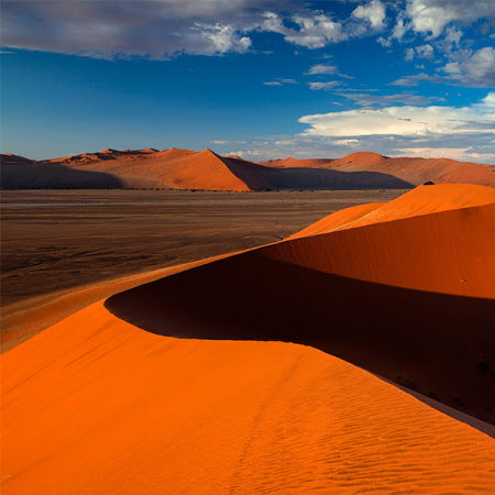 Zwischen den hohen Dünen und dem “Ozean aus Sand” liegt eine Ton-Pfanne, die vom Wasser geformt wurde. Bei heftigen Regenfällen, was nur alle paar Jahre in dieser Gegend vorkommt, füllt sich die Pfanne mit Wasser. Die berühmten Dünen des „Sossusvlei“ umringen diese besondere Landschaft mit tausenden von Ansichten für Fotografen – die schönsten früh am Morgen und am späten Nachmittag, wenn Licht und Schatten fast eine dreidimensionale Ansicht der Landschaft zeigen.