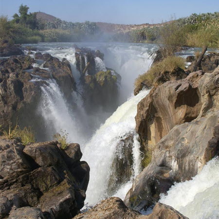 Nackte Felsen wachsen aus der Landschaft, Kaskaden von schäumenden Wasserfällen – eine grüne Insel inmitten der rauen, braunen Berge der Region. Die „Epupa Fälle“ sind eine der vielen Attraktionen im „Kaokoveld“, im fernen Nordwesten von Namibia.