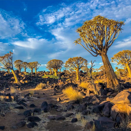 Die Kalahari Wüste umfasst den Osten Namibias und den Westen Botswanas und formt eine lange Wanne von Nordost Namibia bis herunter nach Südafrika. Reihen paralleler roter Dünen, mit Flecken von grünem Grass sind charakteristisch. Unterirdische Wasserläufe ermöglichen das Wachstum alter verknorpelter Akazien in den Tälern der Dünen. Wie unglaublich es auch klingt, diese trockene und feindliche Landschaft ist ein ganz besonderes Habitat für viele Tierarten.