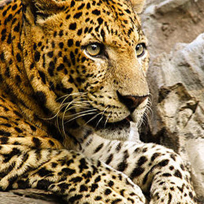 The leopard's skin colour varies between individuals from pale yellowish to dark golden with dark spots grouped in rosettes. Its belly is whitish and its ringed tail shorter than its body. Its pupils are round. Leopards living in arid regions are pale cream, yellowish to ochraceous and rufous in colour; those living in forests and mountains are much darker and deep golden. Spots fade toward the white underbelly and the insides and lower parts of the legs. Rosettes are circular in East African leopard populations, and tend to be squarish in Southern African and larger in Asian leopard populations.