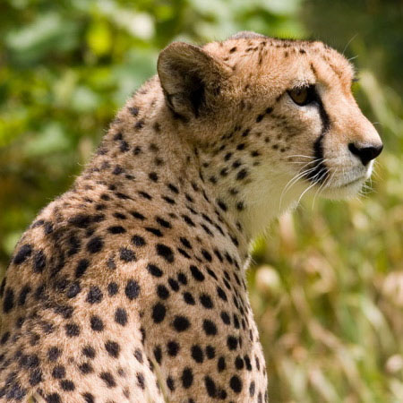 The cheetah is a lightly built spotted cat characterised with a small rounded head, a short muzzle, black tear-like facial streaks, a deep chest, long thin legs and a long tail. Its slender, canine form contrasts sharply with the robust build of the big cats. The coat is covered with numerous round, evenly spaced solid black spots on a tawny to creamy white or pale buff background. Each cheetah has a distinct pattern of spots that can be used to uniquely identify individuals.