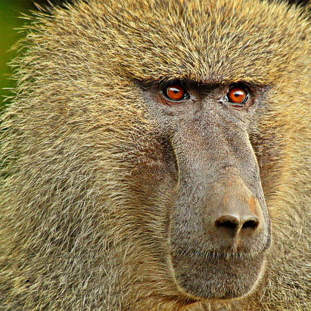 The chacma baboon is generally dark brown to gray in color, with a patch of rough hair on the nape of its neck. Unlike the males of northern baboon species (the Guinea, hamadryas, and olive baboons), chacma males do not have a mane. Perhaps the most distinctive feature of this baboon is its long, downward-sloping face.